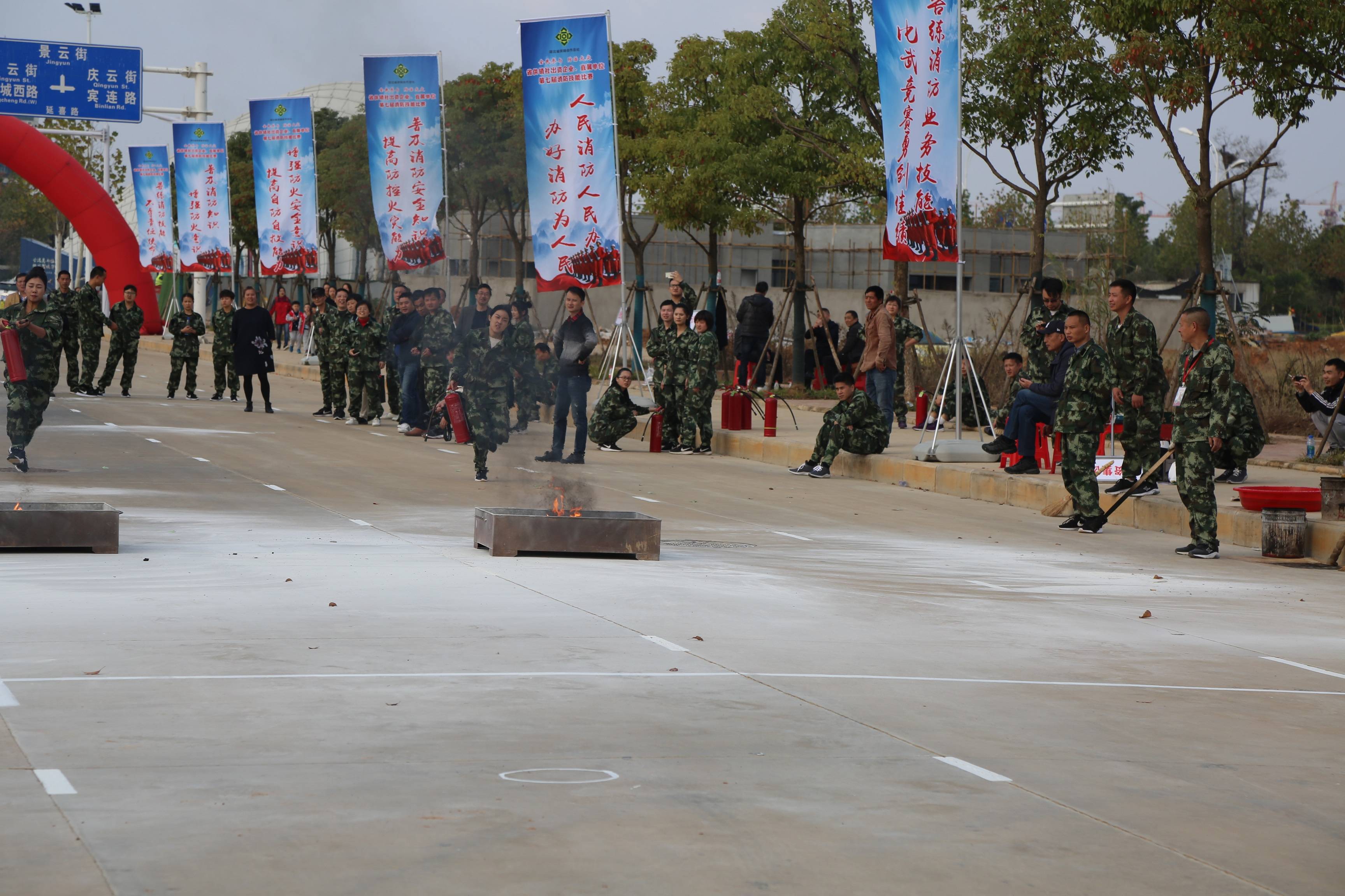 比賽最后一項“干粉滅火器滅油槽”有著奔跑距離最長的賽道。放眼望去,各個參賽隊中都有身高腿長占優(yōu)勢的強大對手,競爭異常激烈。但集團公司的張航、尹楊晶兩位隊員不畏強手,在比賽中展現(xiàn)了集團公司的自信與實力。只見尹楊晶若離弦之箭飛奔到消防器材點,疾速撈起滅火器迅速撲滅起火點,動作連貫、一氣呵成,似一股旋風沖向跑道的盡頭。